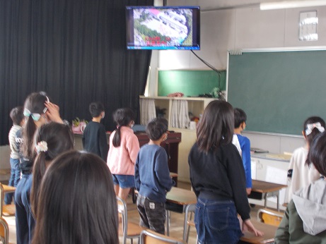 事前に収録した「先生の出し物」や「思い出のスライドショー」など映像で流しました。6年生は、卒業式で歌う歌を披露しました。また、児童会長を通して、校旗の引き継ぎをしました。各学年の子たちは、当日録画した映像を各教室で見ます。