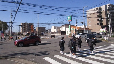「岩崎竹の山西」交差点では、8:00~8:10の間は小学生の登校で大変混雑しています。