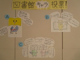図書委員会が図書館キャラクターの投票を行っています。図書館前の掲示板には3つの候補キャラクターが掲示されています。すでに各学級での投票は終わり、本日の図書委員会で決定をします。結果については後日お知らせしたいと思います。