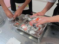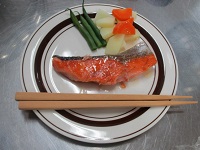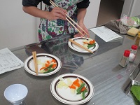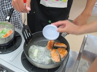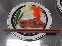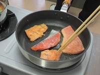 ◆2年家庭科 調理実習「鮭のムニエルと温野菜サラダ」