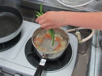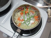 ・水、ジャガイモ、にんじんを鍋に入れて火をかけます。沸騰したらインゲンを入れます。塩も入れます。